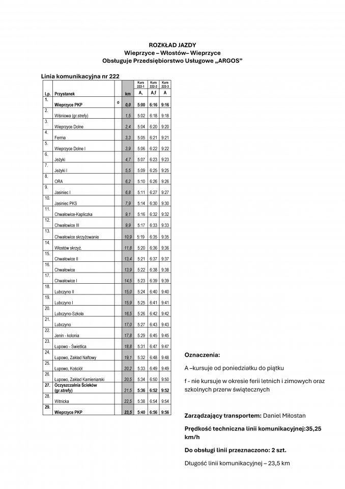 Jak nas poinformowała firma ARGOS od 14 października nastąpiła zmiana rozkładu jazdy linii 222. Kurs poranny z godz.5.26 z Wieprzyc zostanie przesunięty na godz 5.00. Pozostała część rozkładu pozostaje bez zmian.